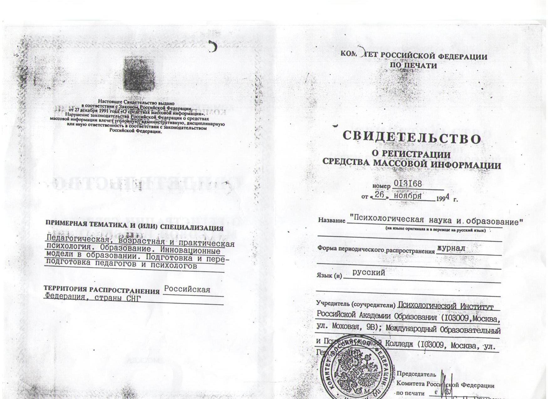 Журнал «Психологическая наука и образование» рецензируемое научное периодическое издание, зарегистрировано в установленном законом порядке как средство массовой информации.