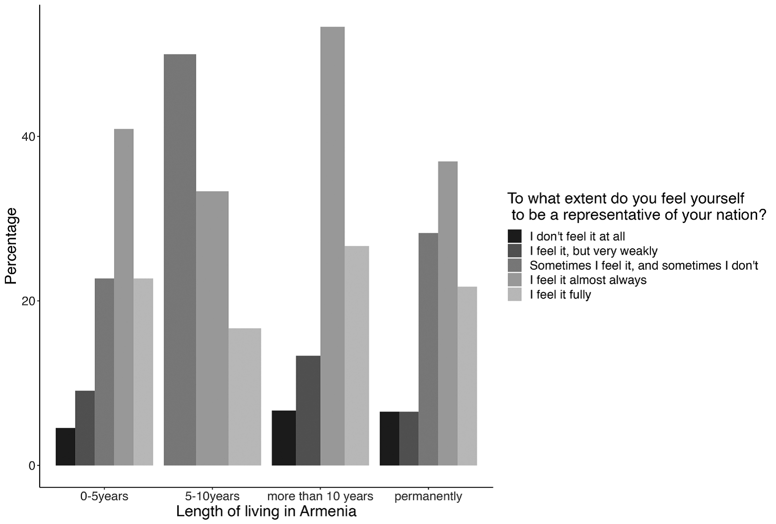 Analysis of the relationship between feeling like an Armenian and the length of residence in Armenia. To the question: “To what extent do you feel like a representative of your nation?” the following answers were received: 5.6% of respondents answered: “I don’t feel it at all”, 7.9% of participants answered: “I feel it, but very weakly”, 23.6% of participants answered: “Sometimes I feel it, and sometimes I don’t”, 40.4% of participants an