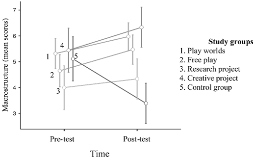 A significant interaction effect between time and the experimental group was found for the macrostructure of the narrative (RM-ANOVA, F(4, 51) = 4.43, p = 0.004, η² = 0.046, see Fig. 1). Post-hoc analysis revealed that, at the post-test stage, children in the PW group scored significantly higher on macrostructure than those in the control group (t = 5.03, Bonferroni-adjusted p < 0.001) and showed a trend-level advantage over children in the RP group (t = 3.42, Bonferroni-adjusted p < 0.049). Children in the FP group scored significantly higher than those in the control group (t = 4.14, Bonferroni-adjusted p = 0.006). Children in the CP group demonstrated significantly better results in narrative macrostructure than those in the RP group (t = 3.63, Bonferroni-adjusted p = 0.029) and the control group (t = 4.86, Bonferroni-adjusted p < 0.001).