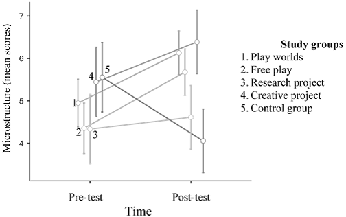 A significant interaction effect between time and the experimental group was also found for the microstructure of the narrative (RM-ANOVA, F(4, 51) = 4.2, p = 0.005, η² = 0.062, see Fig. 2). Children in the PW group (t = 4.26, Bonferroni-adjusted p = 0.004) and the CP group (t = 3.75, Bonferroni-adjusted p = 0.02) scored significantly higher on microstructure than children in the control group.