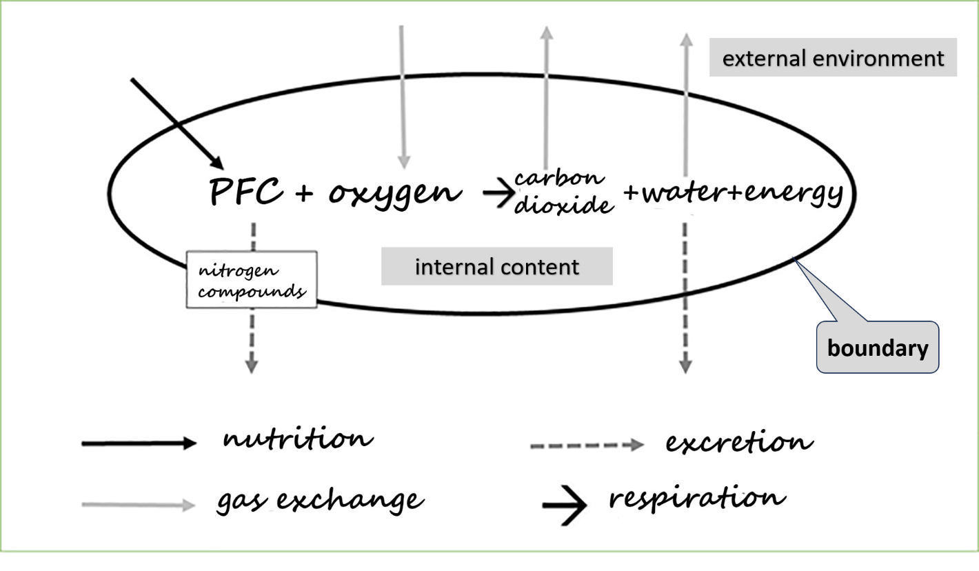 This diagram shows the logical connection among the processes of respiration, nutrition, gas exchange, and excretion, as well as the “location” where these processes occur. Respiration4 — the acquisition of energy — takes place inside the body, whereas all other processes occur at the boundary between the internal and external environment. Through these processes, substances necessary for respiration enter the body, while unnecessary or harmful substances are removed. Thus, the initial relation between the internal and external environment is represented, at the starting point, as a closed line designated by the term “boundary.”