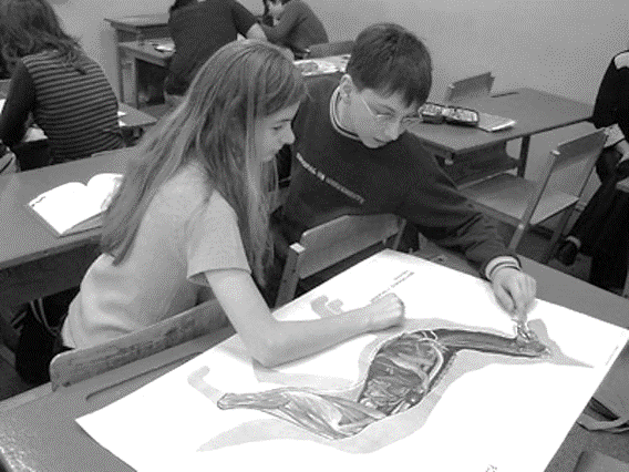 Fig. 4. Working in pairs, students analyse an image of a dog's internal organs, trying to figure out on their own where (at which boundaries) gas exchange, absorption of organic substances, and excretion occur. Understanding the general principles of the structure of multicellular animals allows them to do this