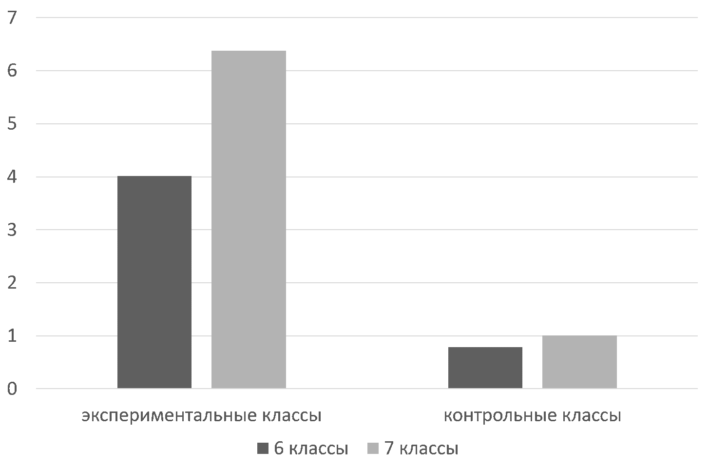 Fig. 5. The diagram shows the average number of statements rated by experts (≥ 3 points out of 5) in the experimental and control classes (1 and 2 years of learning biology). It is clear that in the experimental group, by the end of the 6th grade, students on average write down about four meaningful statements, while for seventh-graders this number increases to six or more (out of 10 possible). In the control group, the indicators remain extremely low: less than one statement in the 6th grade and about one in the 7th grade