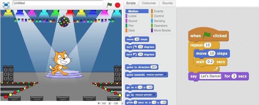 Today, Paper’s ideas have been implemented not only in elementary schools, but also in secondary schools, where students use the Scratch visual programming environment to create cartoons, simple video games, as well as the LEGO Mindstorms plastic robots, which they program to perform simple actions, such as riding a line (Resnick et al., 1988). The Scratch environment implements the same basic principle as the LOGO programming language, but with a more modern graphical interface (see Fig. 3). Instead of writing code, students compose programs by selecting and combining existing blocks. This makes the programming process easier and more intuitive for students. From a psychological perspective, this change was fundamental. Instead of thinking about and introducing new concepts based on existing ones (as in the example of drawing a triangle, which involved three movements and turns), students started to visually combine symbols that represent individual operations on objects into a specific sign system of words, icons, and numerical parameters.