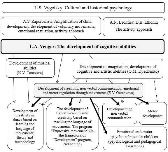 The study of this problem and the creation of a methodology for developing creativity in dance among preschoolers (Gorshkova, 2002) marked the beginning for further research in various directions (see figure).