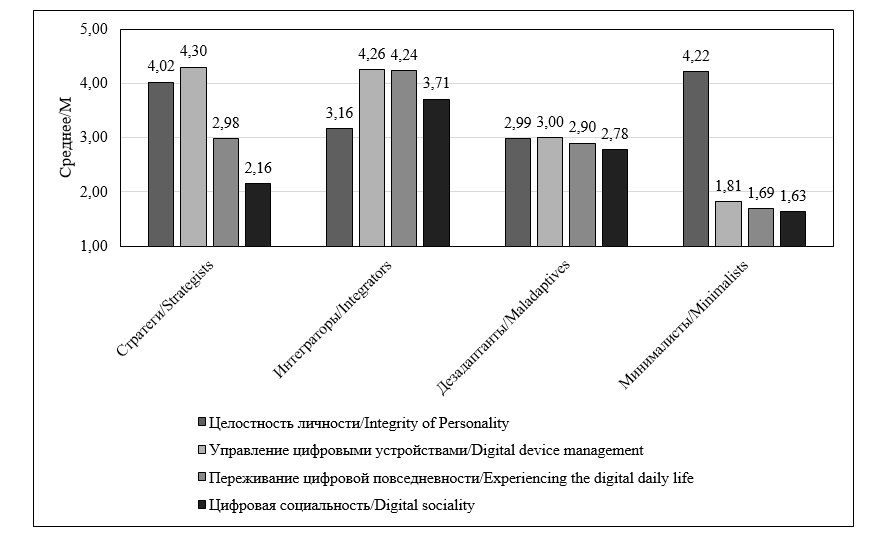Thus, the issue of integrity takes on a new perspective when the personality becomes technologically extended and supplemented by digital tools, presenting new challenges in finding strategies for integration to maintain well-being within a different cultural-historical context (Soldatova, Ilyukhina, 2025). Given the conceptual independence of each of the indicators, extending the Digital Daily Life Self-Management Scale through the addition of a new parameter, integrity, allows for a more comprehensive analysis of the technologically extended personality and the examination of potential personality profiles in terms of adaptation and well-being in a mixed-reality environment.