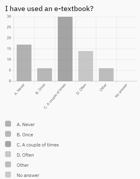 Many students have used an e-textbook a couple of times (25) or often (15), yet a notable portion have never used one (15) or only used one once (5). This limited usage suggests that e-textbooks are still relatively new to many students, necessitating greater emphasis on integrating them into the curriculum and familiarising students with their benefits and features. Despite the increasing availability of digital resources, a significant preference for hard copies remains evident.