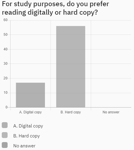 The Figure 2 chart shows that 60 students prefer hard copies for study purposes, compared to only 15 who prefer digital copies. This preference may stem from the tactile, familiar nature of printed books and from potential challenges in adapting to digital reading environments. Educational institutions need to address these preferences and possibly integrate features of hard copy engagement into digital formats to ease the transition.