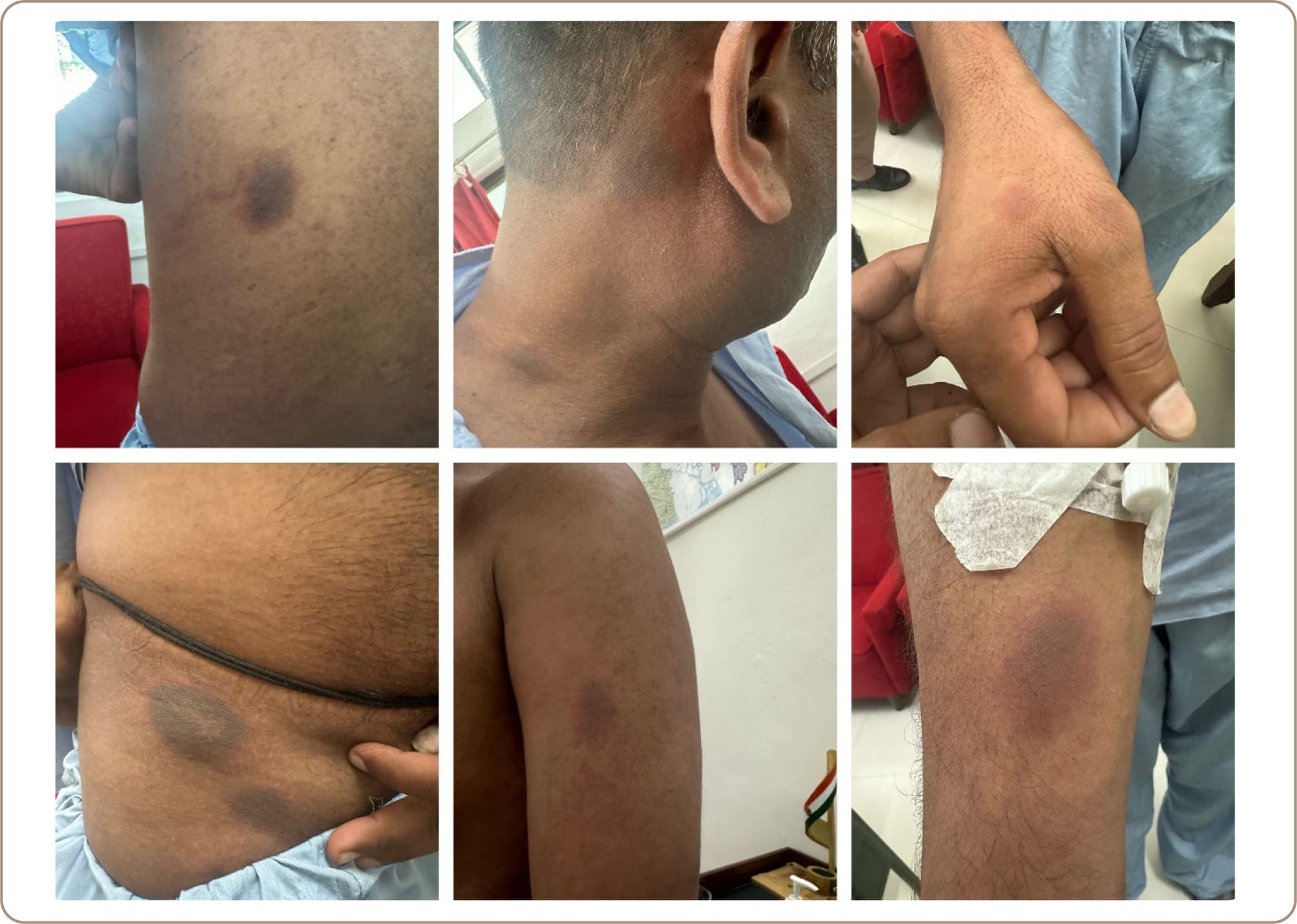 Lesions resolved gradually over a period of one week, leaving behind dark grey huperpigmented lesions. |