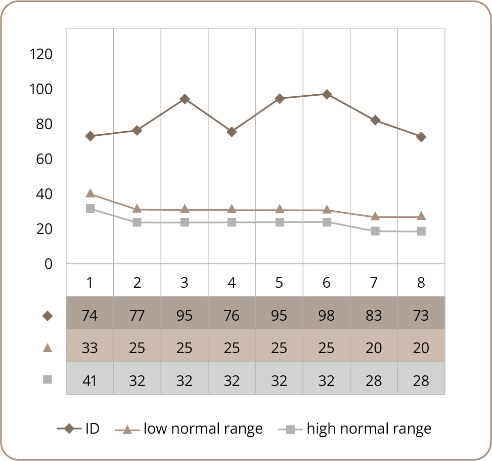 Visual-motor integration was assessed using the General Trends (GT) score from the Bender-Gestalt Test, which aggregates performance across all 9 geometric figures. According to the scoring framework (Appendix 1 in the Supplementary), higher scores indicate greater visual-motor disintegration, perceptual distortion, and developmental lag. Children with ASD had a wide range of scores (32 to 124; median=55.0, IQR=34.0), reflecting considerable heterogeneity in visual-perceptual functioning: from severely impaired to near-typical levels. This vast range likely reflects the diverse cognitive and neurological profiles characteristic of ASD. In contrast, the mild ID group showed a narrower and consistently higher score range (73 to 98; median=83.0, IQR=19.0), indicating more uniform deficit in the visual-motor and spatial domains (Table 2).