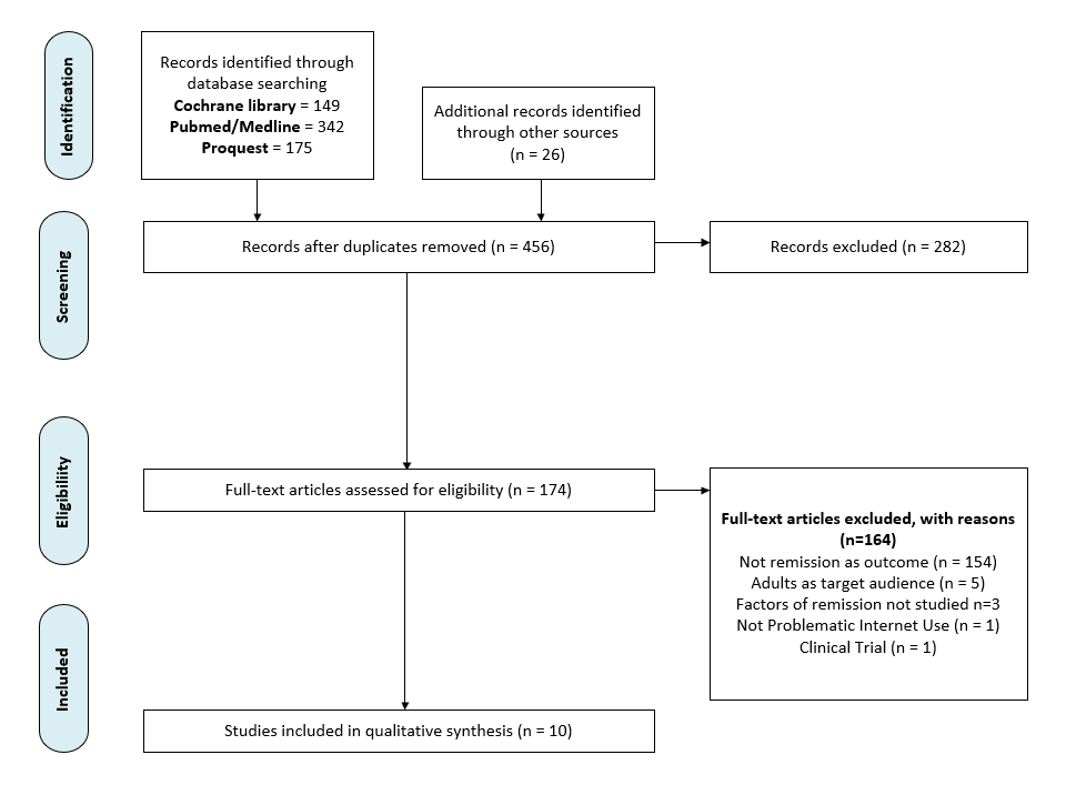 Figure 1 presents a summary of the updated search conducted on the 10th of July 2025 and the inclusion of studies into the review. A total of 666 articles were identified through the database searches. As a result of snowballing and an analysis of the journals, a further 26 studies were included. Following the removal of duplicates, a total of 456 studies remained. Following the evaluation of titles and abstracts, 282 articles were excluded. Of the 174 full-text articles, 164 were excluded on the grounds that they did not meet the pre-established inclusion criteria. These articles were excluded because the outcome of remission was not studied (n=154), because the predictors of remission were not studied (n=3), because in one study the Internet use was not severe, and because in one study the children received the intervention in a systematic manner. In the event of differences of opinion between the two reviewers, these were resolved through consensus and, if necessary, by consulting with a third reviewer.