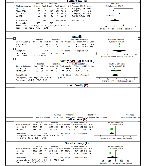 A lower level of social anxiety was found to favor remission of IUD (OR=0,96) (Lau et al., 2017), but this effect was not demonstrated in the study by Ko et al., conducted on a small sample with questionable risk of bias. The meta-analysis (Fig. 2.E) demonstrated that social anxiety had no effect on the probability of remission.