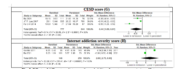 Finally, a lower baseline CIAS score favored remission (Lau et al., 2017). Similarly, Gentile et al. (2011) demonstrated that a lower problematic gaming symptoms score predicts remission. According to Bu et al., baseline Internet addiction score does not affect the probability of remission. The meta-analysis (Fig. 2.H) revealed no statistically significant correlation between baseline Internet addiction score and the probability of remission.