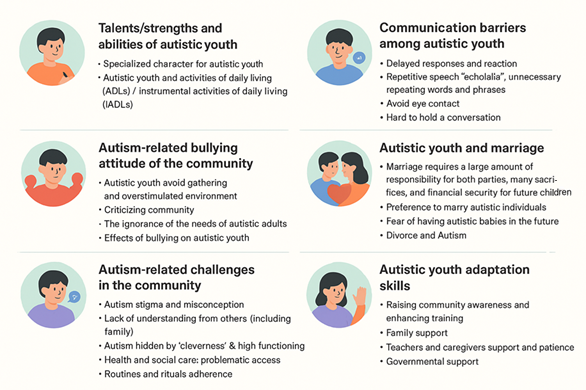 Figure 2 underscores the diverse challenges and advantages faced by autistic youth, corroborating Theme 1: Talents/Strengths and Abilities of Autistic Youth, which highlights their unique nature and potential for independence in both activities of daily living (ADLs) and instrumental activities of daily living (IADLs). Theme 2 highlights the importance of acknowledging their distinct skills while tackling Communication Barriers like slow replies, repetitive speech (echolalia), lack of eye contact, and challenges in maintaining conversations, which hinder effective interaction. Theme 3 recognizes the influence of Autism-Related Bullying, such as overstimulation in social environments, societal judgment, and a lack of understanding regarding the needs of autistic adults, which frequently results in isolation and negatively impacts mental health. Additionally, theme 4 examines the intricacies of marriage and relationships, such as anxieties about genetic tendencies for autism, the compromises necessary for family living, and the difficulties posed by social expectations. Ultimately, the theme 5 and 6 explores Community and Systemic Challenges, including stigma, misunderstandings, concealed autism from high functioning, skepticism about autistic capabilities, and opposition to novel treatment methods. Tackling these challenges necessitates a comprehensive strategy, which involves increasing community awareness, improving training for families and caregivers, and securing strong governmental backing to foster the adaptation and empowerment of autistic young individuals.