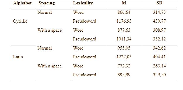 Analysis of variance showed that there is a statistically significant effect of lexicality on reaction time, which explains 8,5% of the variance. Pseudowords are processed faster than words. There is also a statistically significant effect of alphabet, but this factor explains only 0,1% of the variance of the total reaction time. Cyrillic words are processed faster than Latin words. Spacing also shows a statistically significant effect on processing speed and this factor explains 5,5% of the variance in total reaction time. A statistically significant interaction between lexicality and spacing was also obtained. The space between letters led to faster processing and shorter reaction time (fig. 3), where, as in the first experiment, a "stronger" effect of using this typographic feature was noticeable for pseudowords (251,95 ms (95% CI, 228,31 ms — 275,58 ms), p < ,001) than with words (88,39 ms (95% CI, 69,40 ms — 107,38 ms), p < ,001).