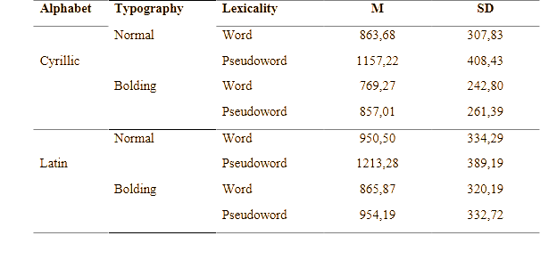The main goal of this experiment was to examine the effect of bolding on the processing speed of words written in Latin and Cyrillic. Bolding is often used to emphasize important parts of the text, which helps to identify key information faster (Pelesek, 2018; Baldwin, 2019), so it is expected that such an effect will be obtained in the Latin and Cyrillic alphabet of Serbian language.