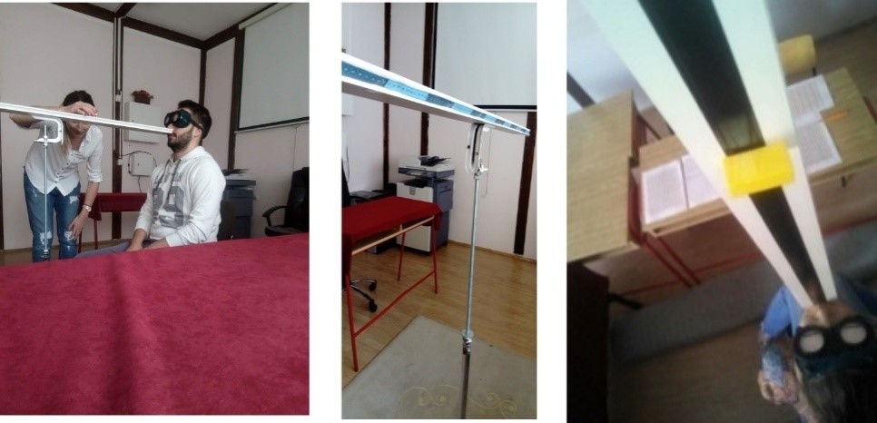 According to specific needs of this research, a movable stand with a flat surface (platform) was designed. The stand is made so that there is a possibility of adjusting the height at which the platform is located, in order to adapt to individual differences in the height of subjects, i.e. the platform is always adjusted to the height of the eyes of each subject. The surface of the platform is white with a black line along the entire length, with surface area of 10 cm * 90 cm and it was used to expose the stimulus to the subject. A yellow rectangular parallelepiped, with dimensions 2.5 cm * 4.5 cm * 1.5 cm, horizontally oriented, attached to the platform with a magnet was used as a stimulus (Fig. 1).