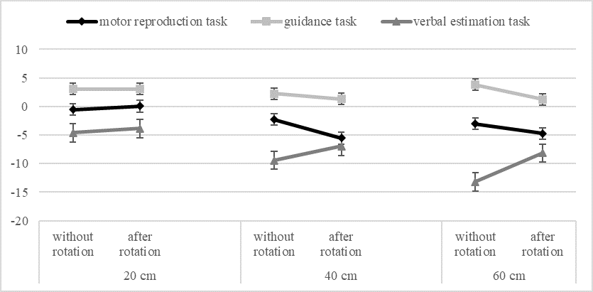 When the respondents were not rotated, all three tasks differed from each other, at all three standard distances. The differences are such that in the guidance task the respondents overestimate the given distances, in the motor reproduction task the errors are close to the zero or there is a slight underestimation of the distance, while in the verbal assessment task the respondents underestimate the given distances. In more detail, at the closest distance, of 20 cm, the errors in the guidance and verbal assessment task are similar in intensity, but they are in the opposite direction, i.e. overestimation occurs during guidance and underestimation during verbal assessment. At other distances, 40 cm and 60 cm, the errors in verbal assessment tasks are also in the direction of underestimation, but they are far more intense than the errors obtained in the other two tasks. As for motor reproduction task, at the closest distance, of 20 cm, is estimated quite precisely, almost without error, while greater distances, 40 cm and 60 cm, are slightly underestimated. The underestimation of the distance in the motor reproduction task at 40 cm and 60 cm is of similar intensity as the distance overestimation in the guidance task, i.e. the errors are of similar intensity, only in the opposite directions (Fig. 2).