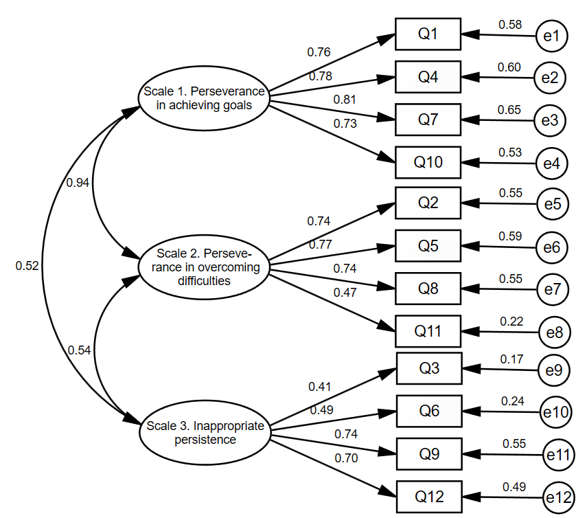 Descriptive statistics and internal consistency indices (Cronbach's alpha) for all subscales of the questionnaires used are presented in Table 1. The internal consistency of all subscales of the Perseverance Scale is satisfactory to good, with Cronbach's alpha values ranging from 0.68 to 0.85. Correlations between subscales 1 and 2 with subscale 3 are low (r = 0.39 and r = 0.42, respectively), while a strong relationship is observed between subscales 1 and 2 (r = 0.76). These results align with the confirmatory factor analysis (CFA) findings (Fig. 1).