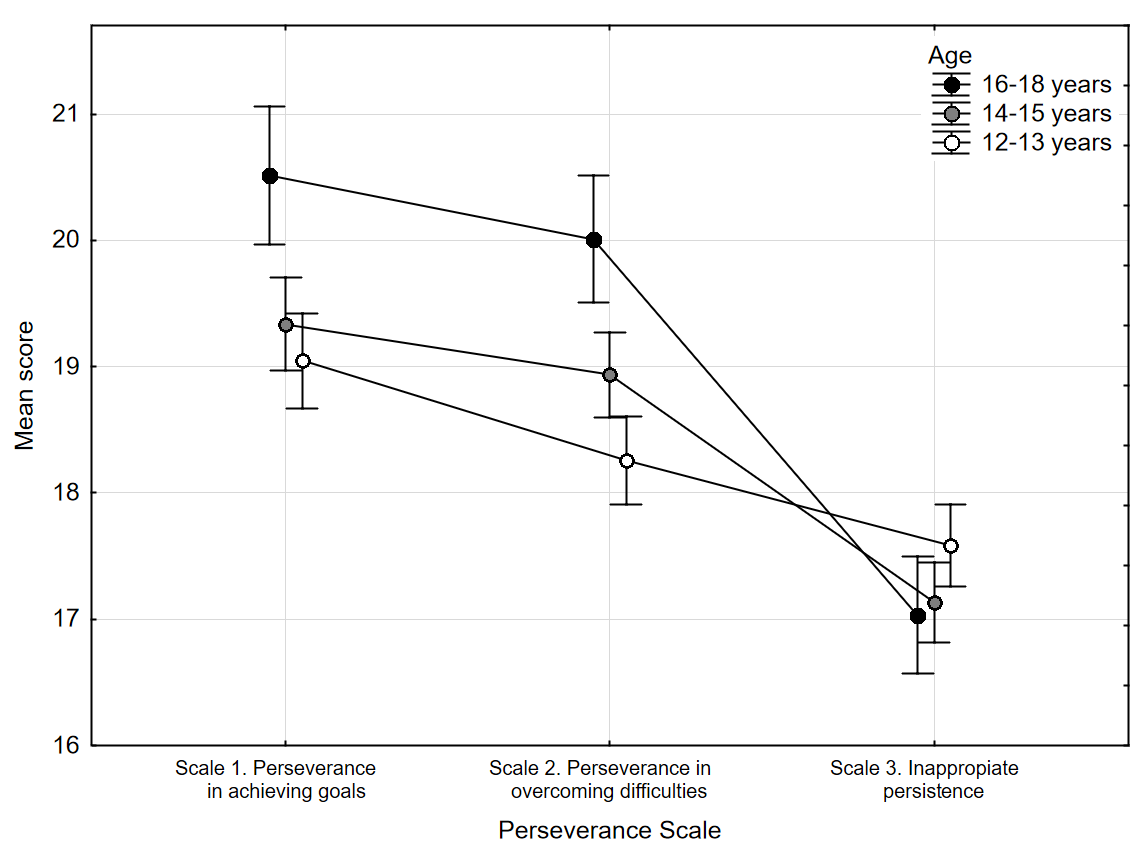 A similar analysis was conducted to examine age-related changes in perseverance. Results indicated that perseverance increased with age (main effect F(2, 1715) = 6.04; p = 0.002; h2 = 0.01), although the effect was small. The interaction effect was more pronounced (F(4, 3430) = 18.06; p < 0.0001; h2 = 0.02), indicating that different components of perseverance changed differently across age groups (Fig. 2). Tukey's post hoc test revealed that for 12-13-year-olds, all perseverance indicators significantly differed: Perseverance in Overcoming Difficulties was statistically significantly higher than Inappropriate Persistence (p = 0.0028), and Perseverance in Achieving Goals was statistically significantly higher than Perseverance in Overcoming Difficulties (p = 0.0002). For adolescents aged 14-15 and 16-18, the indicators of Perseverance in achieving goals and Perseverance in overcoming difficulties do not differ significantly (p = 0.28 and p = 0.52, respectively). However, scores for Perseverance in Overcoming Difficulties increased significantly with age, rising from approximately 18 points at ages 12-13 to 19 points at ages 14-15, and 20 points at ages 16-18. Changes in Perseverance in Overcoming Difficulties were the most substantial (approximately 2 points), followed by changes in Perseverance in Achieving Goals (approximately 1.5 points). Conversely, changes in Inappropriate Persistence were negligible, statistically insignificant, and fluctuated within 0.5 points. Norms for all subscales of the Perseverance Scale across different age groups are provided in Appendix 3.