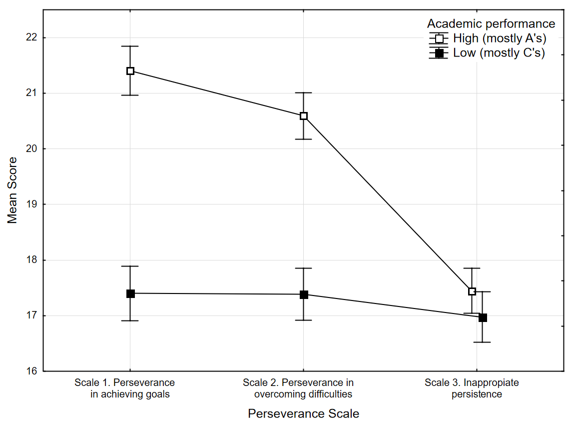 To test this hypothesis, a two-way ANOVA was performed, comparing two contrasting groups of students with differing academic performance: high-achieving students (those receiving predominantly A’s, N = 448) and low-achieving students (those receiving predominantly C’s, N = 360) across all subscales of the Perseverance Scale. The analysis revealed a statistically significant interaction between academic performance and the subscales of the Perseverance Scale, indicating distinct perseverance profiles for high- and low-achieving students (F(2, 1612) = 69.77; p<0,0001; h2 = 0.08). Specifically, high-achieving students exhibited higher levels of Perseverance in Achieving Goals and Perseverance in Overcoming Difficulties, whereas their levels of Inappropriate Persistence did not differ significantly from those of low-achieving students (Fig. 3).