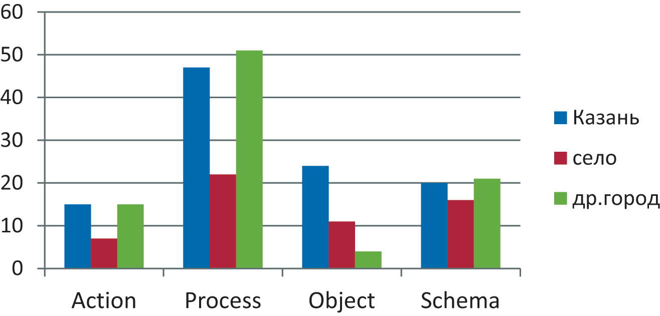 Rural and out-of-town students showed better results compared to Kazan graduates, especially at the more advanced APOS stages. The high number of conceptual errors among Kazan students at the Schema stage is associated with difficulties in analyzing function graphs and solving irrational equations.