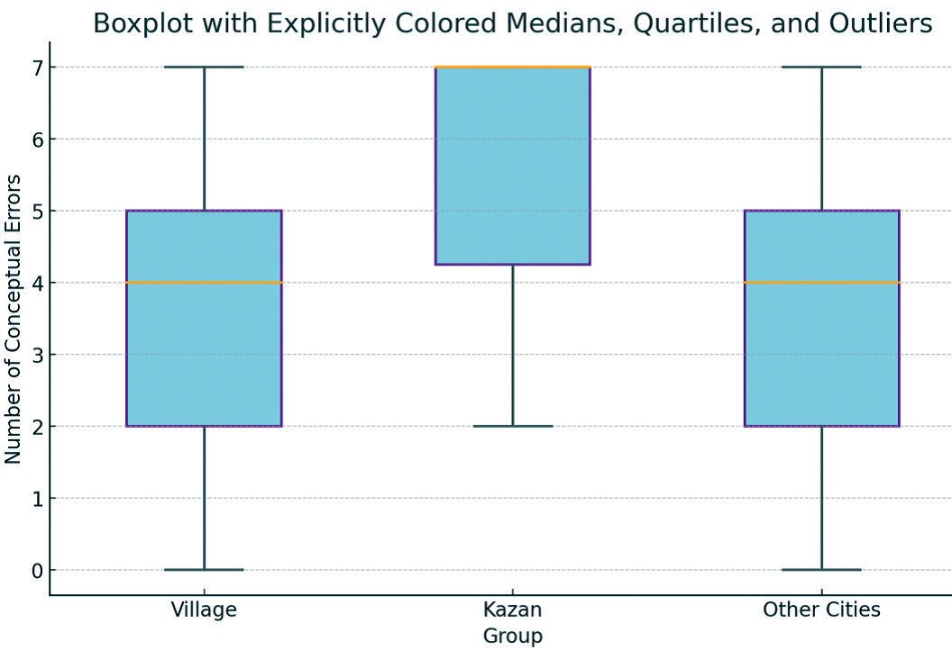To visually present the differences between the groups (rural areas, Kazan, and other cities), we include a Boxplot (Figure 3) showing the distribution of the number of conceptual errors for each group at the Schema stage, with median values highlighted in yellow.