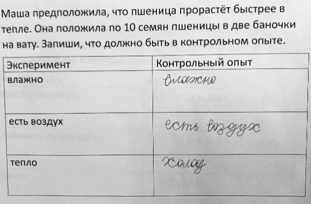 This work was offered to students completing the fourth grade in a Moscow public school (25 students, including 10 girls and 15 boys) as well as to students from two second-grade classes at the end of their second year of study in the same school (50 students, including 20 girls and 30 boys). For comparison with this group and to analyze the process and difficulties involved in mastering basic experimentation, we included a second-grade class from another Moscow public school where students studied the World Around Us course within the Elkonin-Davydov system (27 students, including 14 girls and 13 boys). This comparison was preliminary; therefore, we did not account for many other factors that could influence students’ results—such as the educational level of parents or teachers’ teaching experience.