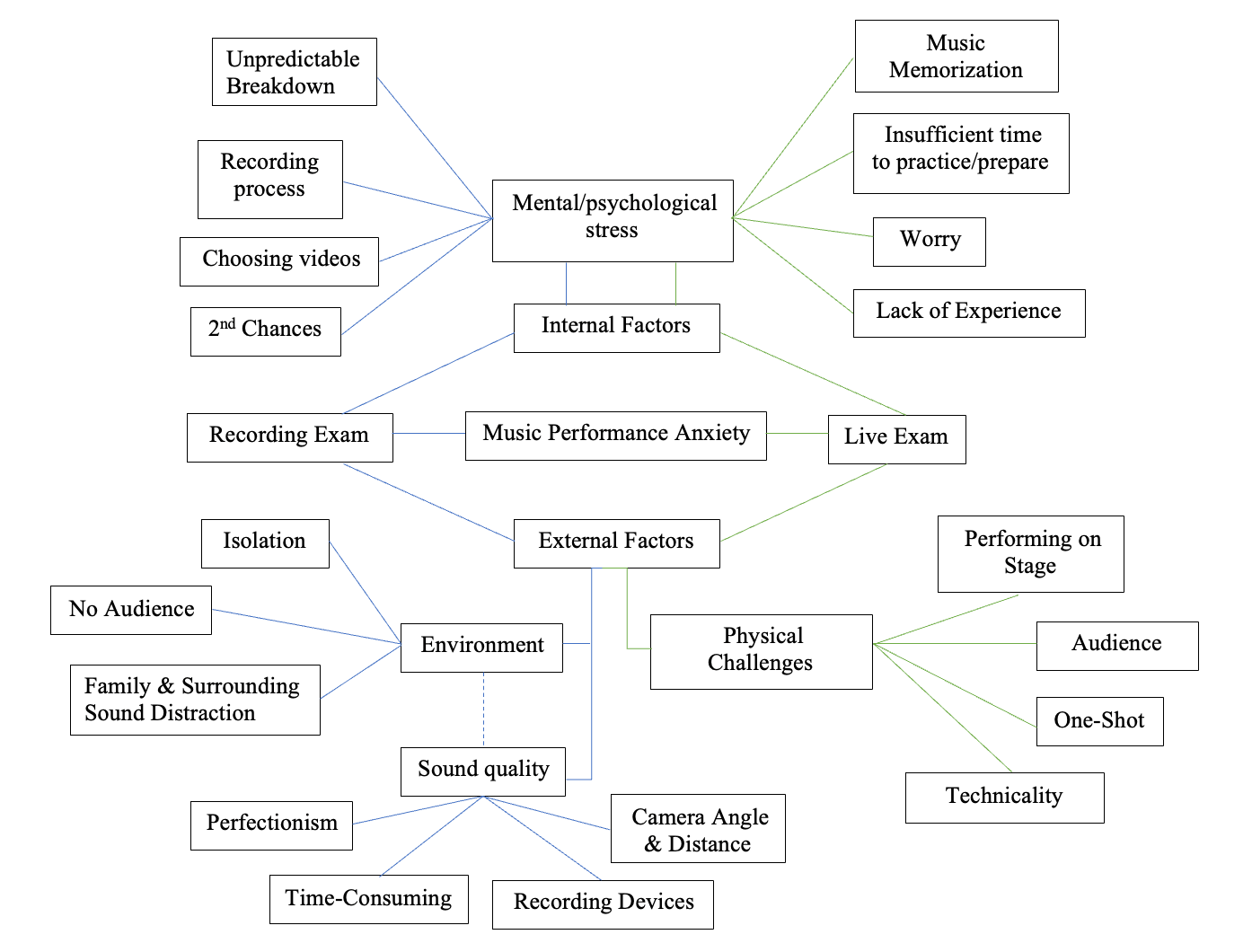 For the recorded exam, three main themes were derived from the data, namely: (1) Environment, and its sub-themes (a) Isolation, (b) No Audience, (c) Family and Surrounding Sound Distraction; (2) Sound Quality, and its sub-themes (a) Perfectionism, (b) Time-consuming, (c) Recording Devices, (d) Camera Angle and Distance; and (3) Mental/psychological Stress and its sub-themes (a) Unpredictable breakdown, (b) Recording Process, (c) Choosing Videos, (d) 2nd Chances.