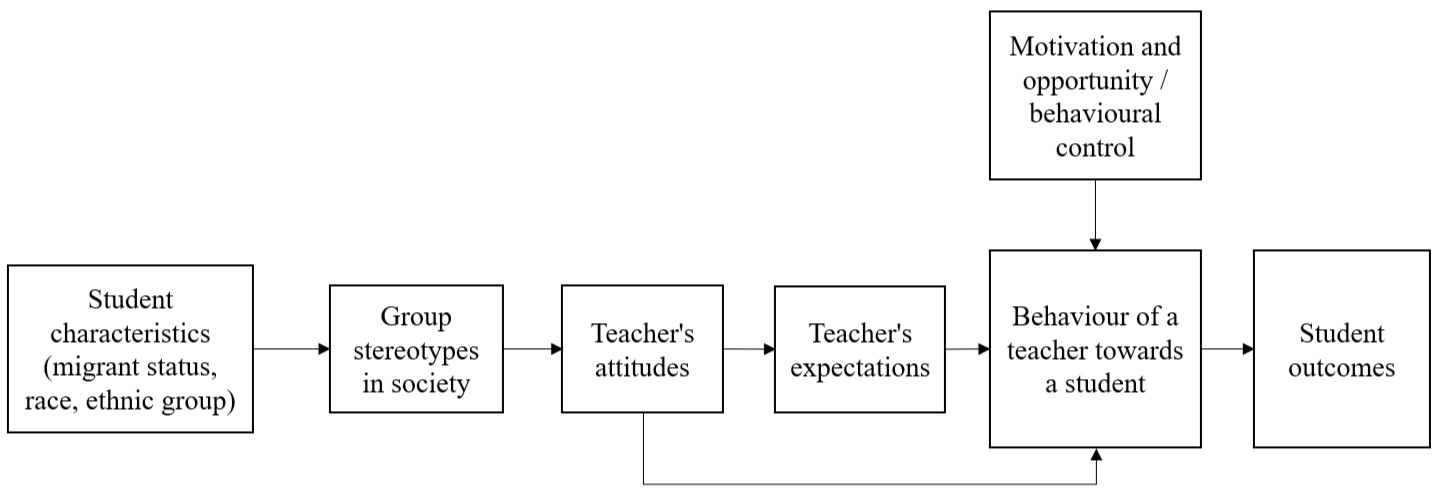 To select and analyze studies on the relationship between teachers’ attitudes and expectations and the academic outcomes of students with a migrant background, we used the following theoretical model (see Figure 1).