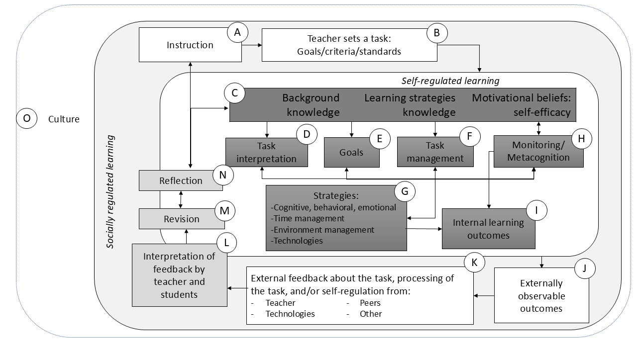 In this study, we examine metacognition through the lens of the theoretical framework of self- and social regulation of learning (Akhmedjanova, 2024). The theoretical framework (Figure) integrates three domains: self-regulated learning (C-I, L-N), socially regulated learning (A-B, J-L), and culture (O) (Akhmedjanova, 2024). Social regulation of learning includes learning methods (A-B) and formative assessment practices (J-K).
