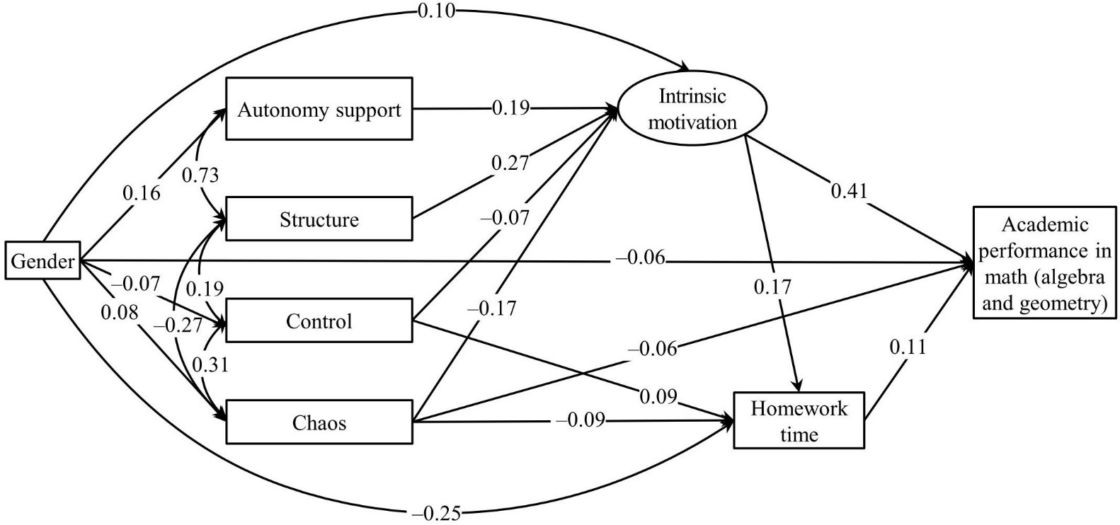The model indicates that intrinsic motivation shows the strongest relationship with mathematics performance. Homework time also makes a smaller, but statistically significant, positive contribution to performance; the contribution of the chaotic style is negative and weak.
