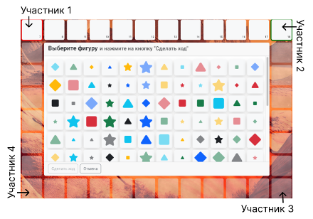 At the beginning of the task, each player can only see their own section of the game board. They are able to observe the movement of the highlighted grid frames representing other players, but they cannot see the shapes placed by them. Moreover, communication between players is initially blocked. Once a player reaches the corner—where their moves intersect with those of another participant—they gain access to the chat window and are also allowed to see the figures placed by others in the room. If one player reaches the corner first and places a new shape, the updated figure becomes visible to others only once they too cross into the shared area.