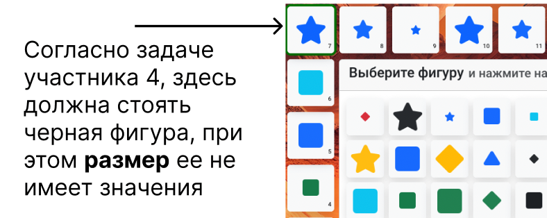 Each team member is also assigned a unique individual task, which is not known to the other participants. These individual tasks are distributed randomly and require each player to construct the perimeter based on a specific rule known only to them (such as the sequence of figures by color, size, shape, or animation).