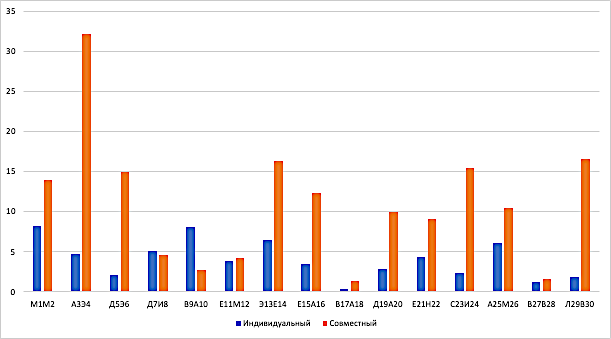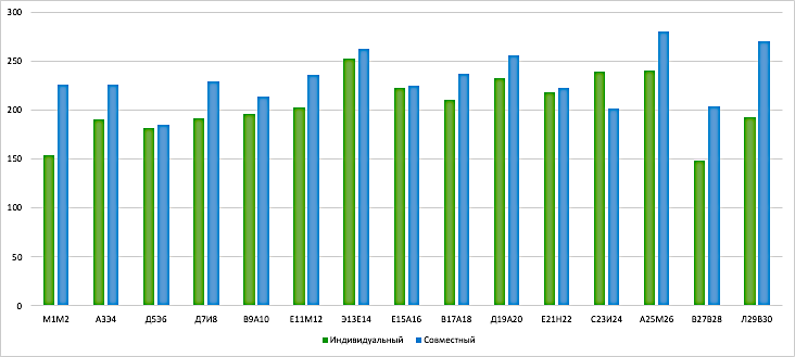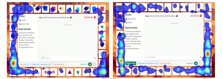 However, we found no consistent correlation between the type of joint activity organization and the structure of joint fixations displayed in the heatmaps. Nor was there a reliable association between the frequency or duration of joint fixations and the mode of interaction (organizational vs. reflexive-analytical). This may be due to the fact that modes of interaction are complex formations, or what V.V. Rubtsov and A.V. Konokotin describe as “emotionally-meaningful unities”, which cannot be fully captured through psychophysiological indicators alone, such as eye movement data.