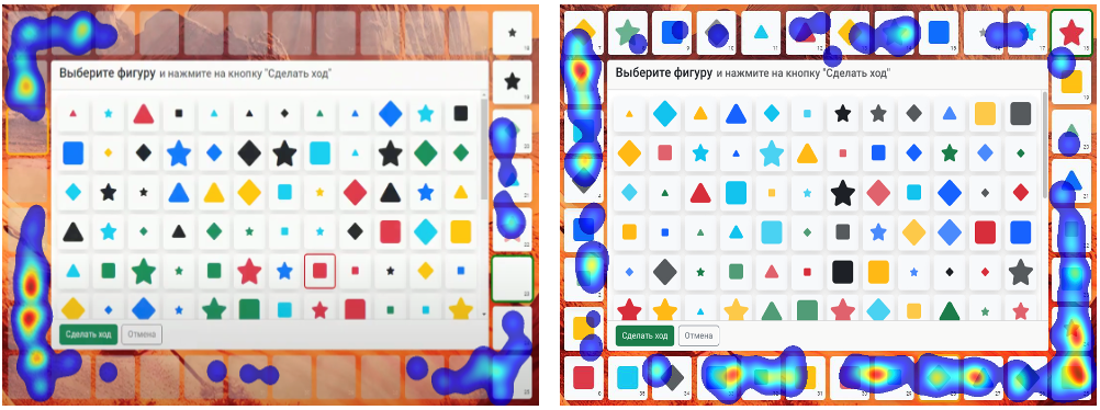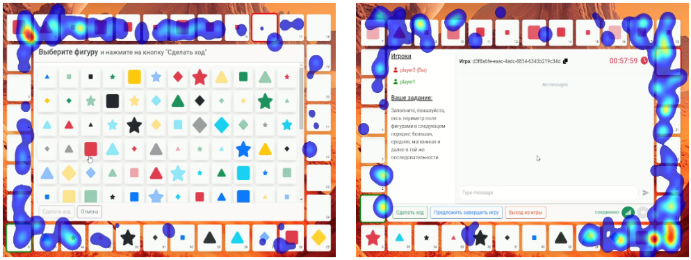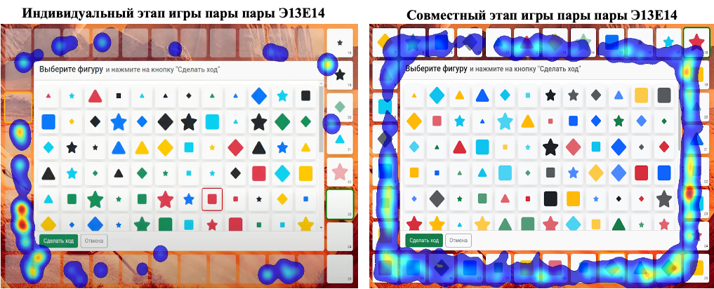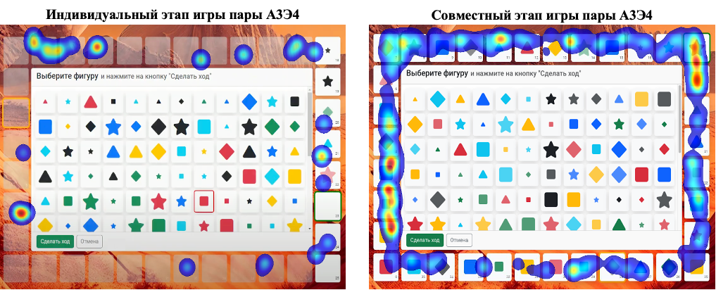 Similar to individual fixations, joint fixations at the individual stage tended to concentrate in areas where one participant's actions began to disrupt the rule used by the other participant. These were the moments where they would “encounter” one another and begin to negotiate interaction, establish a shared goal, model a collaborative solution, and coordinate their individual efforts (see Fig. 7 and Fig. 8). Thus, joint fixations at the individual stage were closely linked to reflective processes, aimed at understanding both one’s own and the partner’s grounds for action in the context of collaborative work.