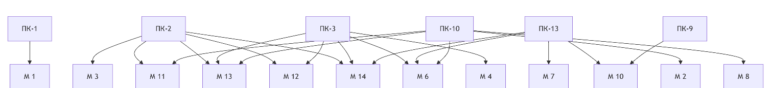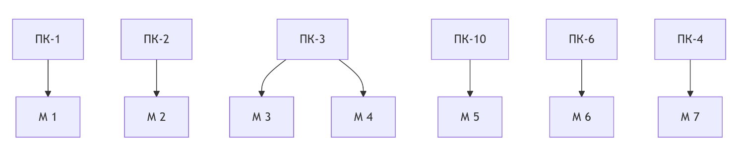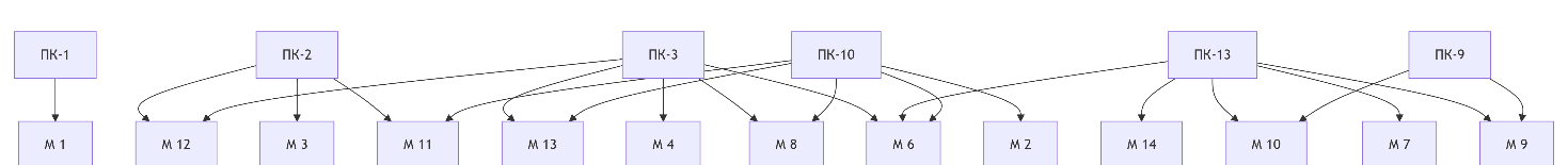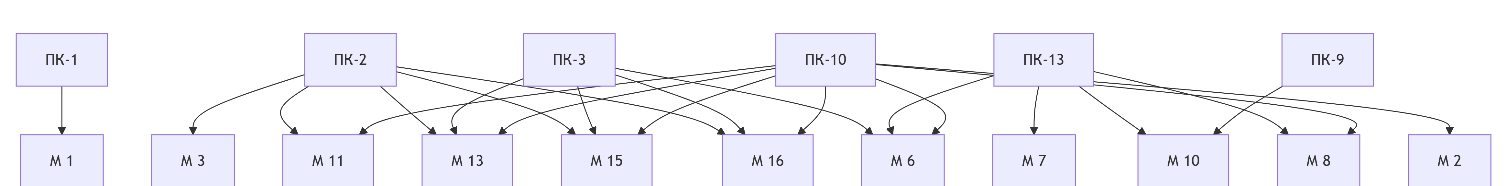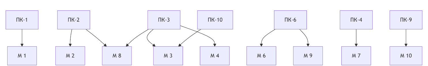 Each PC is associated with specific educational modules (M) in the structure of the professional unit (PU) of the BPEP, using adjacency matrices. The PU can then be visually represented as a directed graph, the vertices of which are the PC and M, and the arrows represent the connections between them (PC → M). Note that the PU structure also includes various types of practical training, but their association with the PC is generally comprehensive and straightforward.