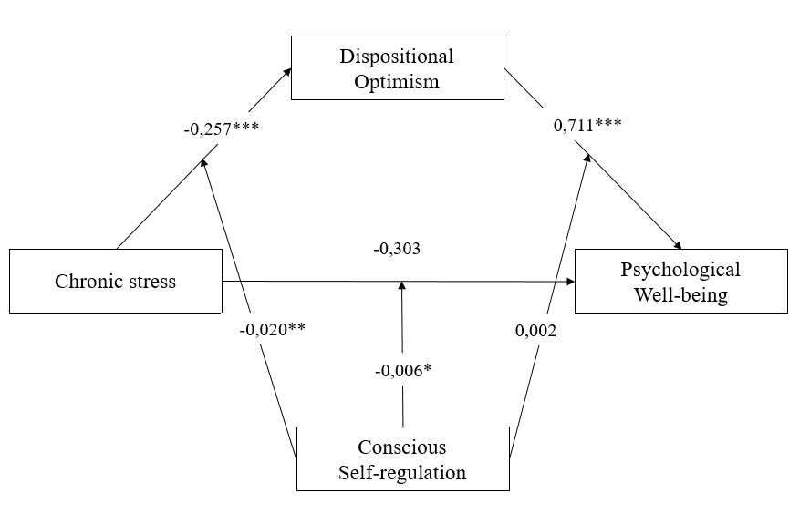 Based on the resource approach to the comprehensive study of conscious self-regulation (V.I. Morosanova) and the empirical findings obtained in this study, a theoretical model was proposed to address the question of whether the level of conscious self-regulation functions as a moderator of the relationship between chronic stress, optimism, and psychological well-being. This model also aimed to clarify the specific features of the impact of chronic stress on psychological well-being through optimism among students with different levels of self-regulation.