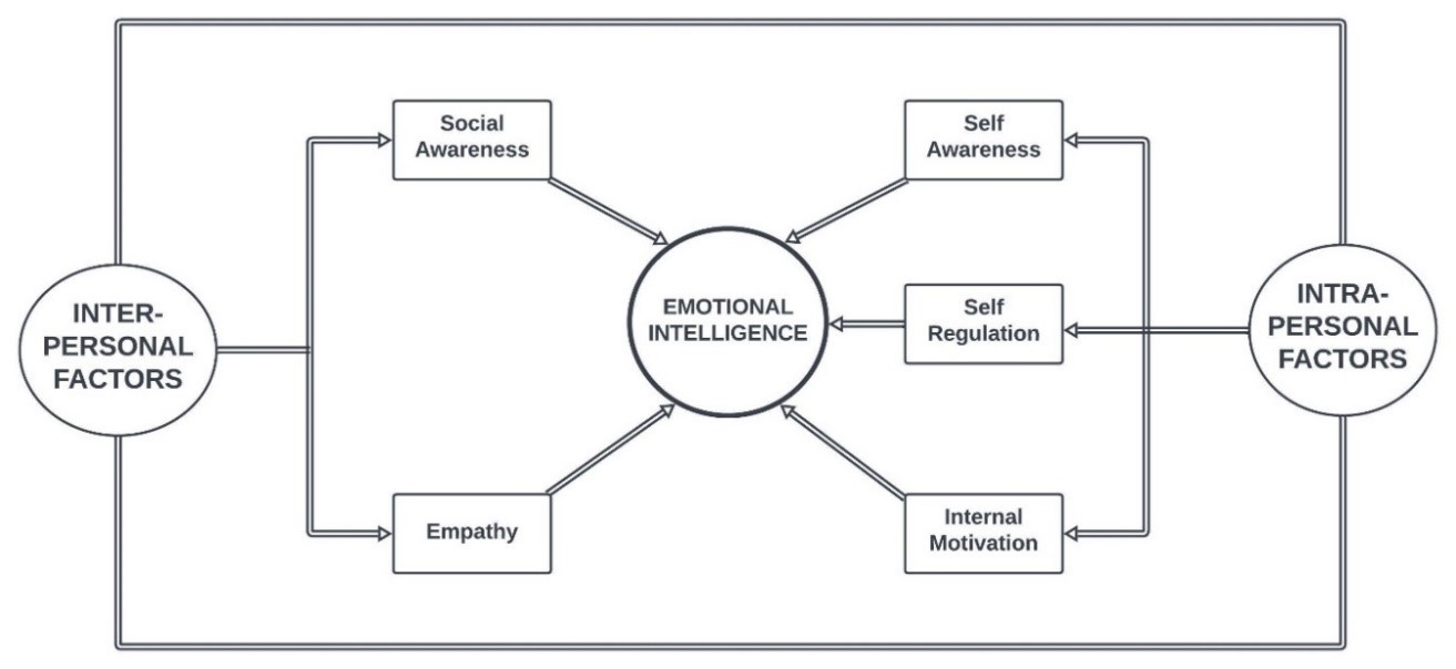 This study adopted Goleman’s mixed model of emotional intelligence, which outlined five core domains: self-awareness, social awareness, self-regulation, empathy, and motivation (Goleman, 1995). These were grouped into two broad dimensions, as shown in Figure 1. The interpersonal dimension included social abilities such as empathy and contextual sensitivity (Owan, 2023), which supported emotional regulation during social interactions (Mercader-Rubio et al., 2022). The intrapersonal dimension focused on internal abilities like emotional self-control and goal-driven motivation (Okwuduba et al., 2021), supported by reflective thinking. These two dimensions worked together, and their relevance depended on the specific emotional or social demands present in a given situation.