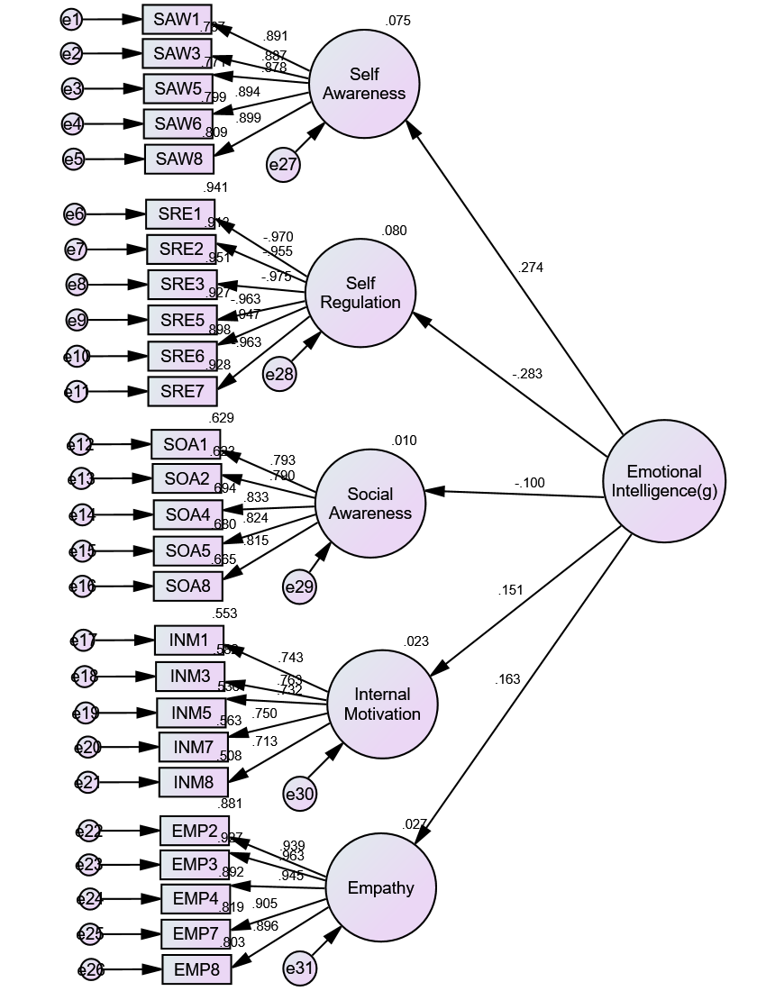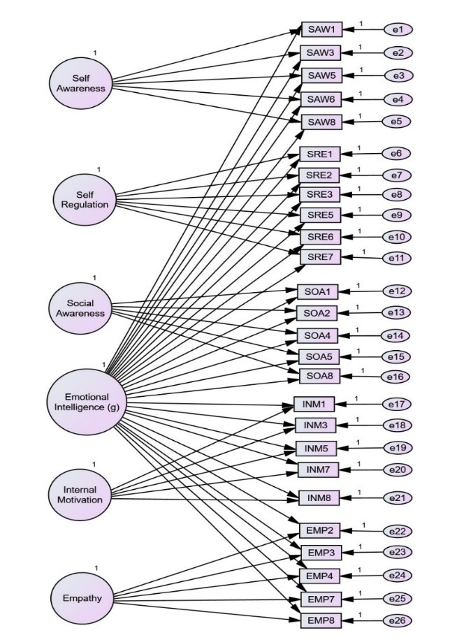 This study developed and validated the Academic Staff Emotional Intelligence Questionnaire (ASEIQ), a psychometric instrument designed to assess emotional intelligence (EI) among university lecturers in Nigeria. Grounded in a five-factor model, such as self-regulation, empathy, self-awareness, social awareness, and internal motivation, the ASEIQ aligns with Goleman’s framework (Goleman, 1995), which conceptualizes EI as an integration of personal and social competencies. Confirmatory factor analysis (CFA) revealed that a bifactor model, positing EI as both a general construct and domain-specific factor, provided the optimal fit. This finding corroborates prior research advocating bifactor approaches in EI measurement (Owan, 2023; Owan, Bassey, Ubi, 2023), enabling simultaneous evaluation of global EI and subcomponents to clarify their interrelationships (Fotopoulou et al., 2021).
