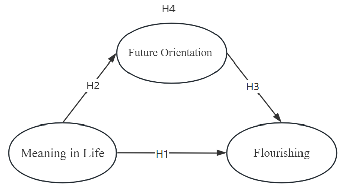 The present study aims to address these gaps through two interrelated objectives: (1) to examine the relationship between meaning in life (MIL) and flourishing within China’s unique cultural context, and (2) to investigate future orientation (FO) as a mediator of this relationship. Specifically, the study proposes the following hypotheses: H1: MIL positively predicts flourishing among Chinese undergraduates; H2: MIL positively predicts FO among Chinese undergraduates; H3: FO positively predicts flourishing among Chinese undergraduates; and H4: FO mediates the relationship between MIL and flourishing among Chinese undergraduates. The conceptual framework underpinning these hypotheses is presented below (see Fig.).