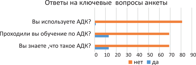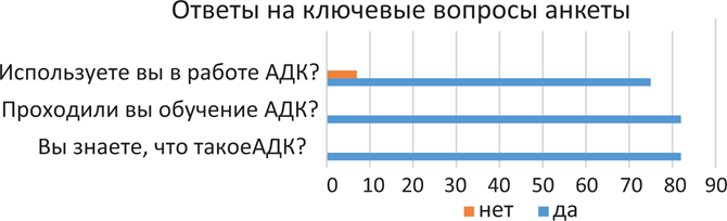 Анализ двух ответов дал такие результаты: на вопрос «Вы знаете, что такое АДК?» положительный ответ дали 13 человек из 82. На вопрос «Вы используете АДК?» положительный ответ дал только один сотрудник.