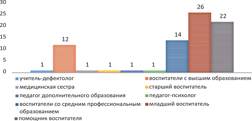 Для обучения по программе в социальном учреждении было проведено уточнение числа специалистов в разных областях коррекционной педагогики, психологии, также к обучению была привлечена медицинская сестра (рис. 2).