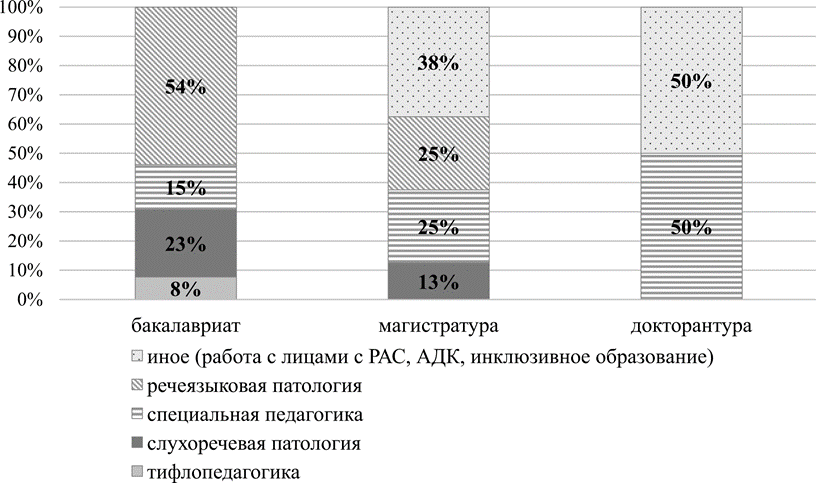 Из 13-ти программ бакалавриата, в которых содержались отдельные дисциплины и/или темы, посвященные АДК, 54% относились к подготовке специалистов в области речеязыковой патологии, 23% — слухоречевой патологии, 15% — специальной педагогики, 8% — тифлопедагогики. Из 8-ми программ магистратуры темы или дисциплины, посвященные АДК, были выявлены в 25% программ подготовки специалистов в области речеязыковой патологии и специальной педагогики, в 13% программ подготовки в области слухоречевой патологии, инклюзивного образования, работы с лицами с РАС, дополнительной и альтернативной коммуникации. Также отдельные темы и дисциплины содержались в программах докторантуры по направлениям «специальная педагогика» и «АДК» (рис. 1).