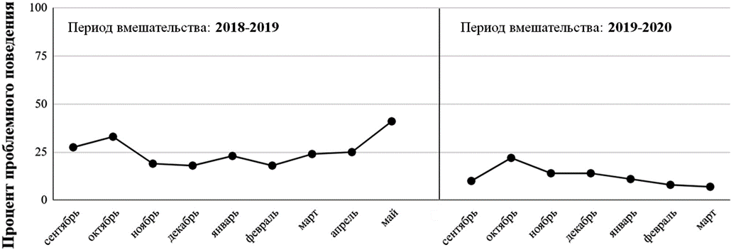 На рис. 1 представлен средний показатель процента проблемного поведения по месяцам в оба периода вмешательства.