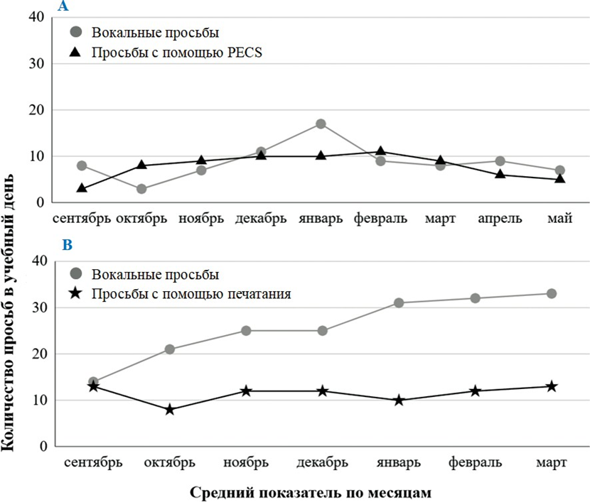 Рис. 2. Среднее количество вокальных просьб и просьб с помощью системы PECS за учебный день по месяцам в период с сентября 2018 г. по май 2019 г. (A) и с помощью печатания в приложении за учебный день по месяцам