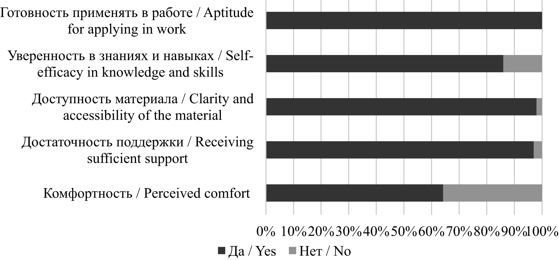 Вопросы в анкете были закрытыми дихотомическими с ответами да/нет. Анкетирование проводилось в анонимной форме, чтобы участники могли свободно выражать свое мнение, не ориентируясь на возможную реакцию наставников на критические замечания.