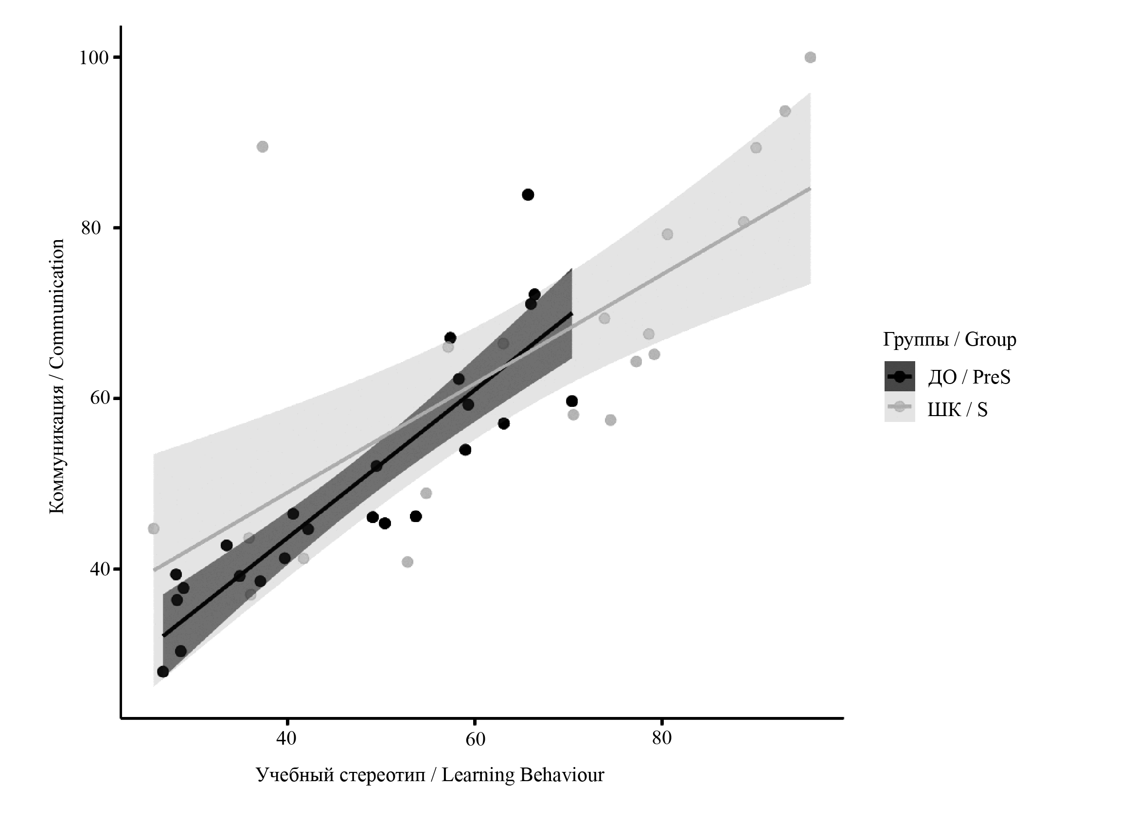 Рис. 1. Взаимосвязь шкал «Учебный стереотип» и «Коммуникация» в группах ДО и ШК: точки данных окрашены в соответствии с группой (группа ДО — темно-серый, ШК — светло-серый; линии регрессии с областями стандартной ошибки показаны отдельно для каждой группы