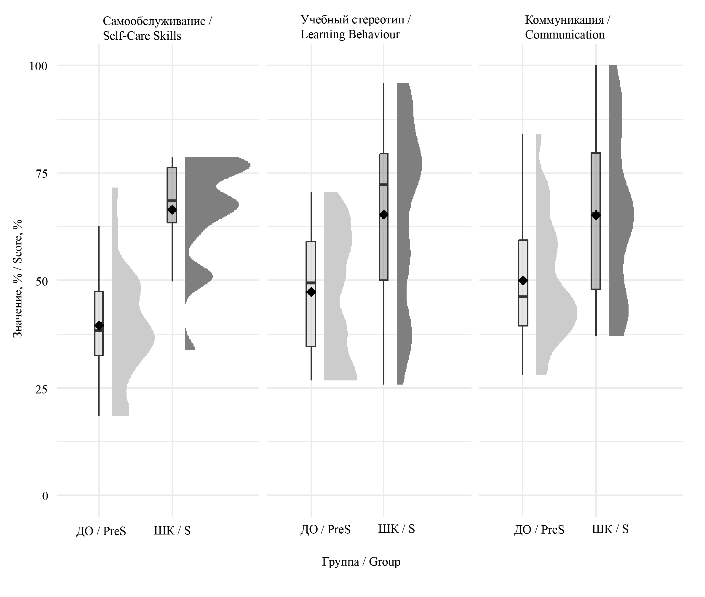 Fig. 2. Comparison of Three KT Scales Between Preschool (PreS) and Primary School (S) Groups: the distributions are shown (probability density and boxplots with medians); mean values are shown by diamonds.