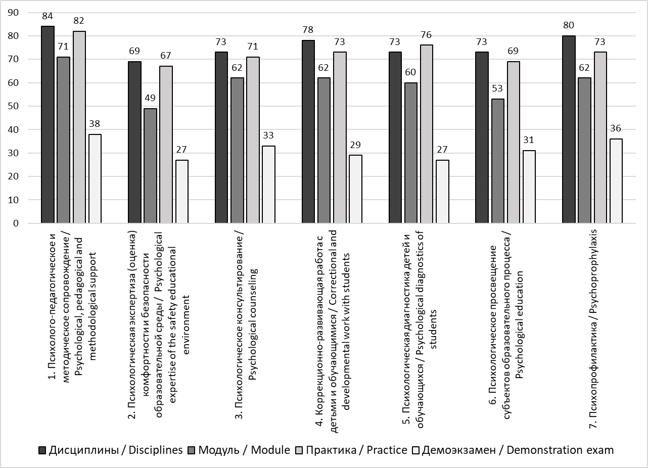 В целом подготовка педагога-психолога в педагогических университетах осуществляется по семи трудовым функциям профессионального стандарта педагога-психолога (психолога в сфере образования) (Об утверждении…, 2015) в процессе изучения дисциплин, профессионально-ориентированных модулей, практик (рис.). Треть педагогических университетов уже включили в процесс подготовки педагогов-психологов демонстрационный экзамен по трудовым функциям.